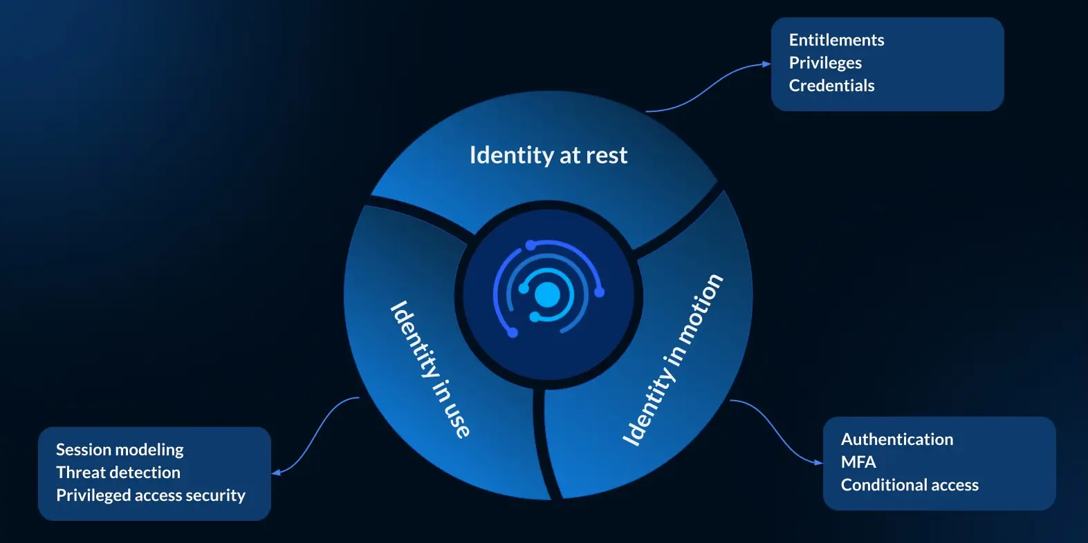 - Identity at Rest: Ensuring account lifecycles, entitlements, and credential policies are configured securely.